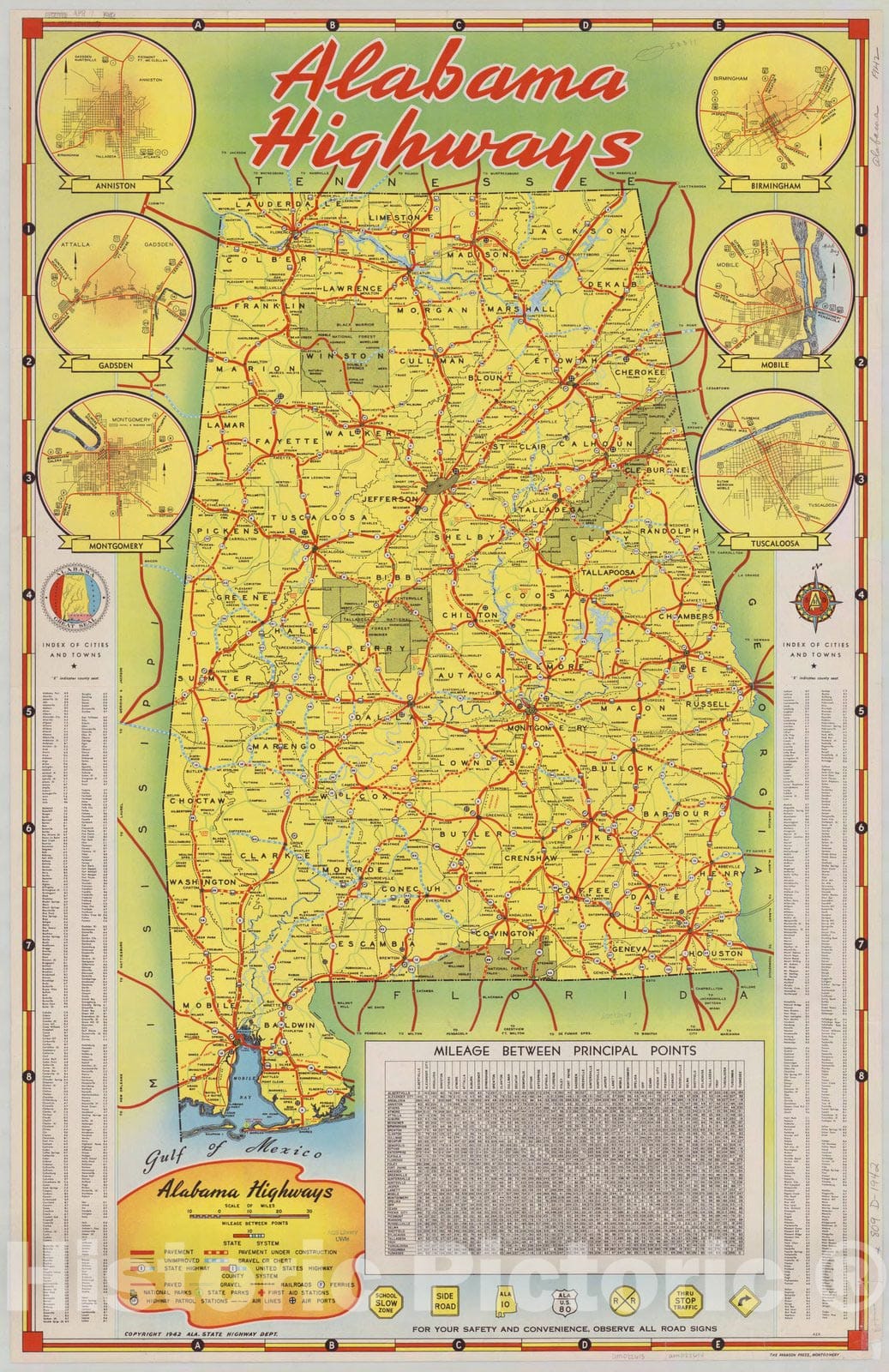 Map : Alabama 1942, Alabama highways , Antique Vintage